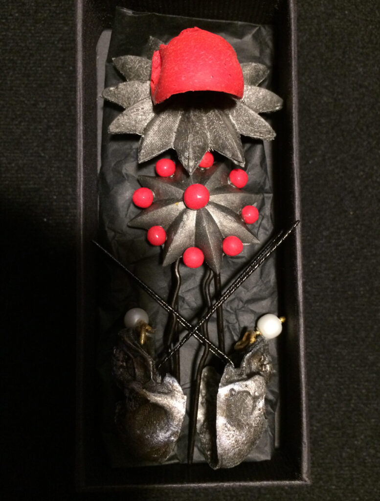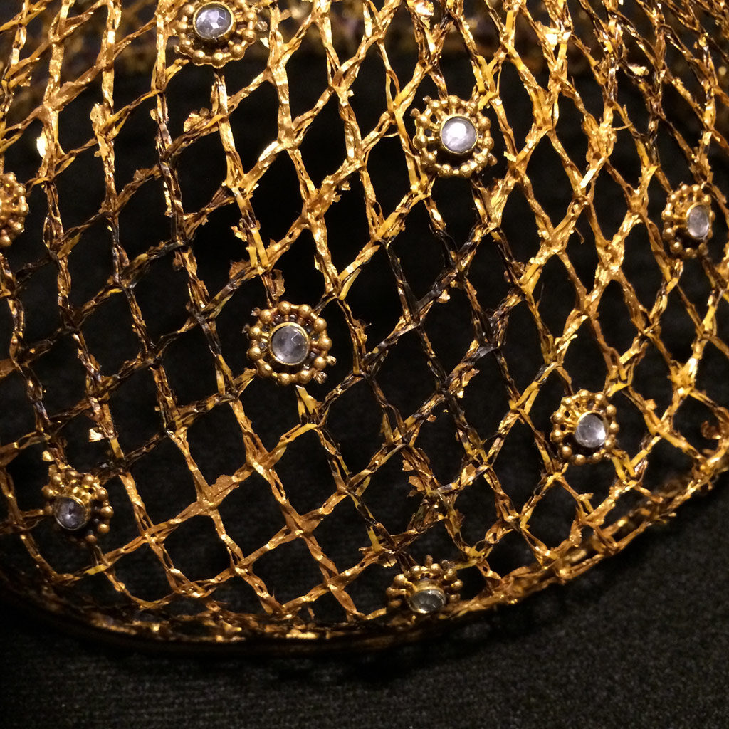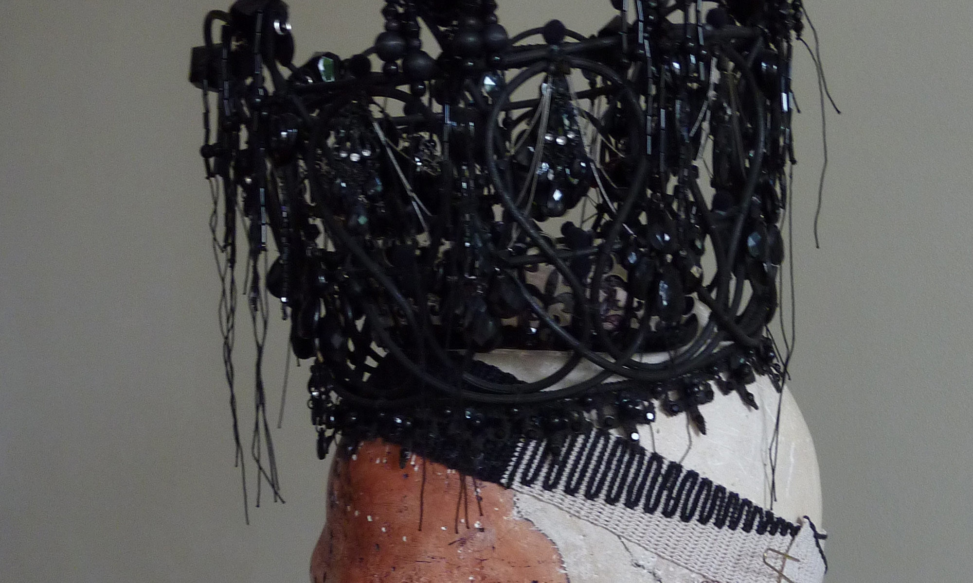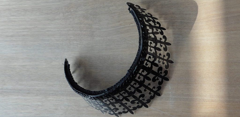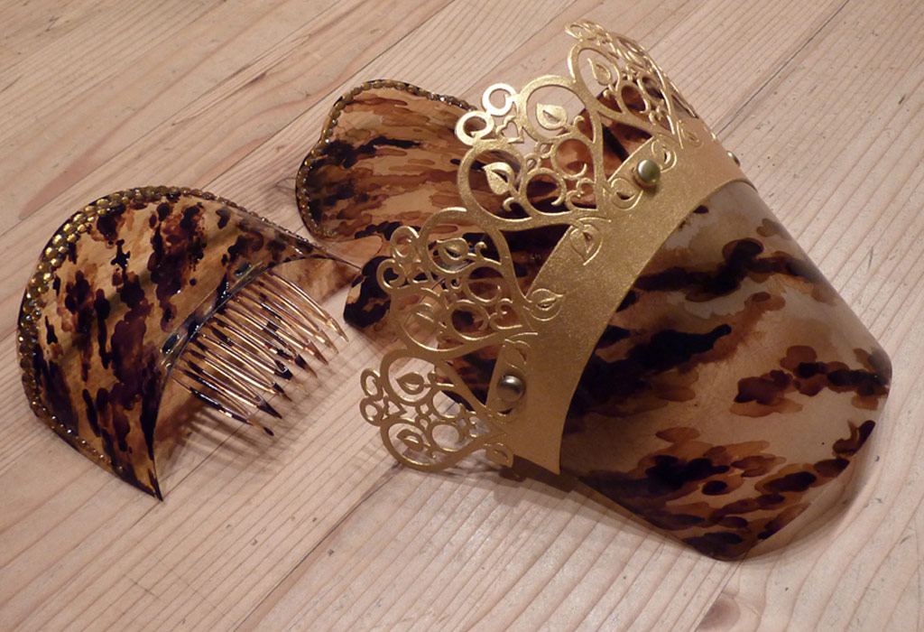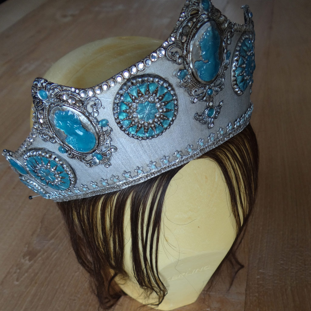 Verwendet wurden folgende Materialien (gehäkelt und vernäht): Atlasband, Metallspitze, Polyesterschmucksteine, Gewebekleber, Baumwollgarn, Maschendraht (Sechseckgeflecht), Filtermatte, Fiberglas (Fliegengitter), Nessel, Pailletten, Zierkordel, Acrylfarbe, Haarnadeln.