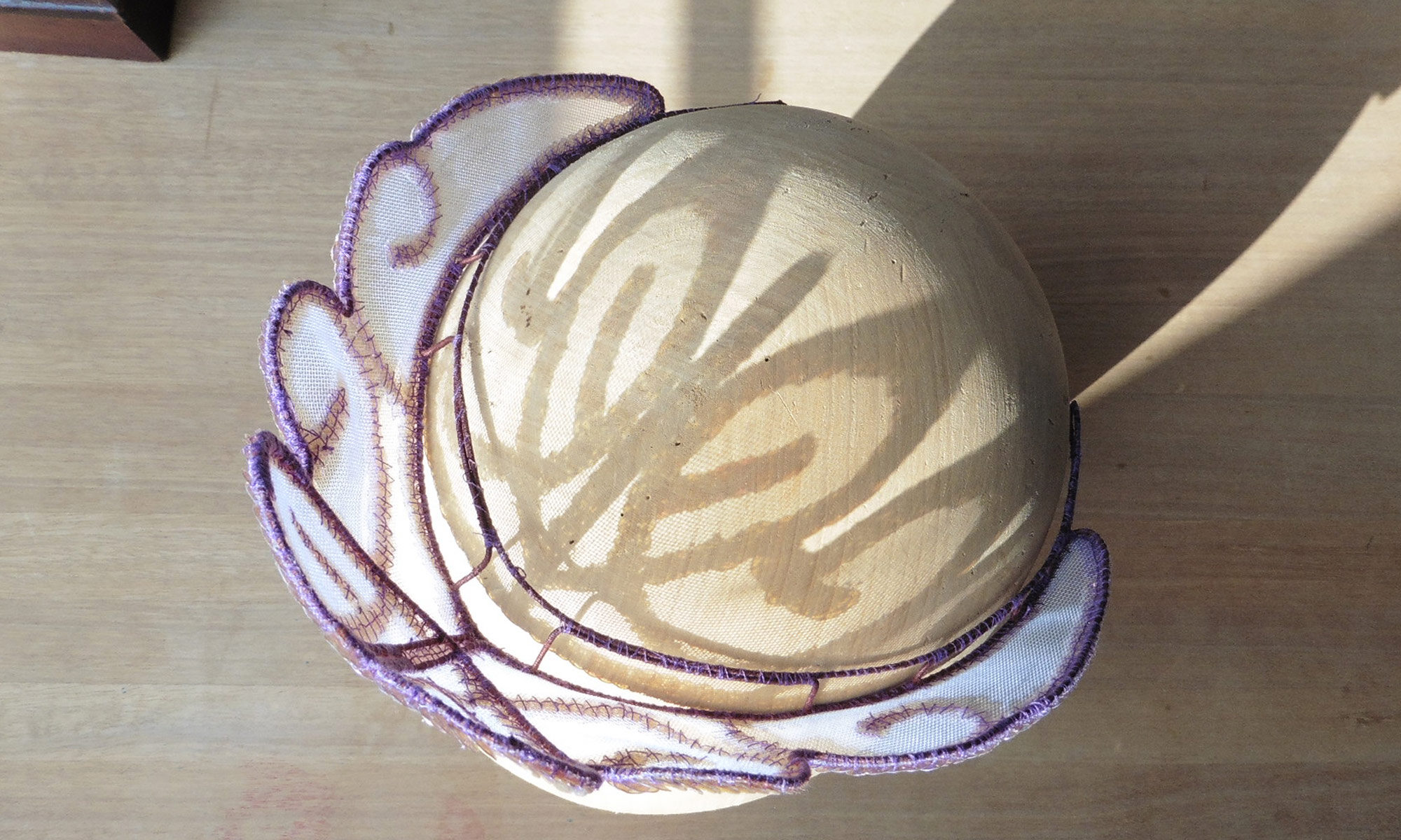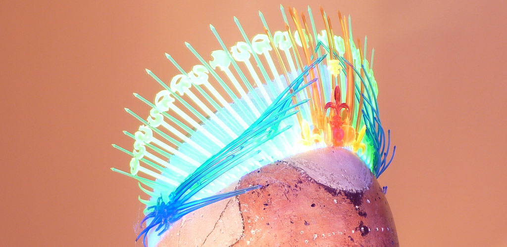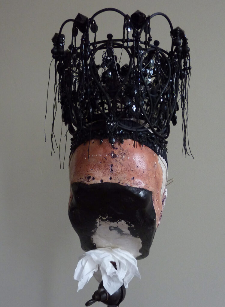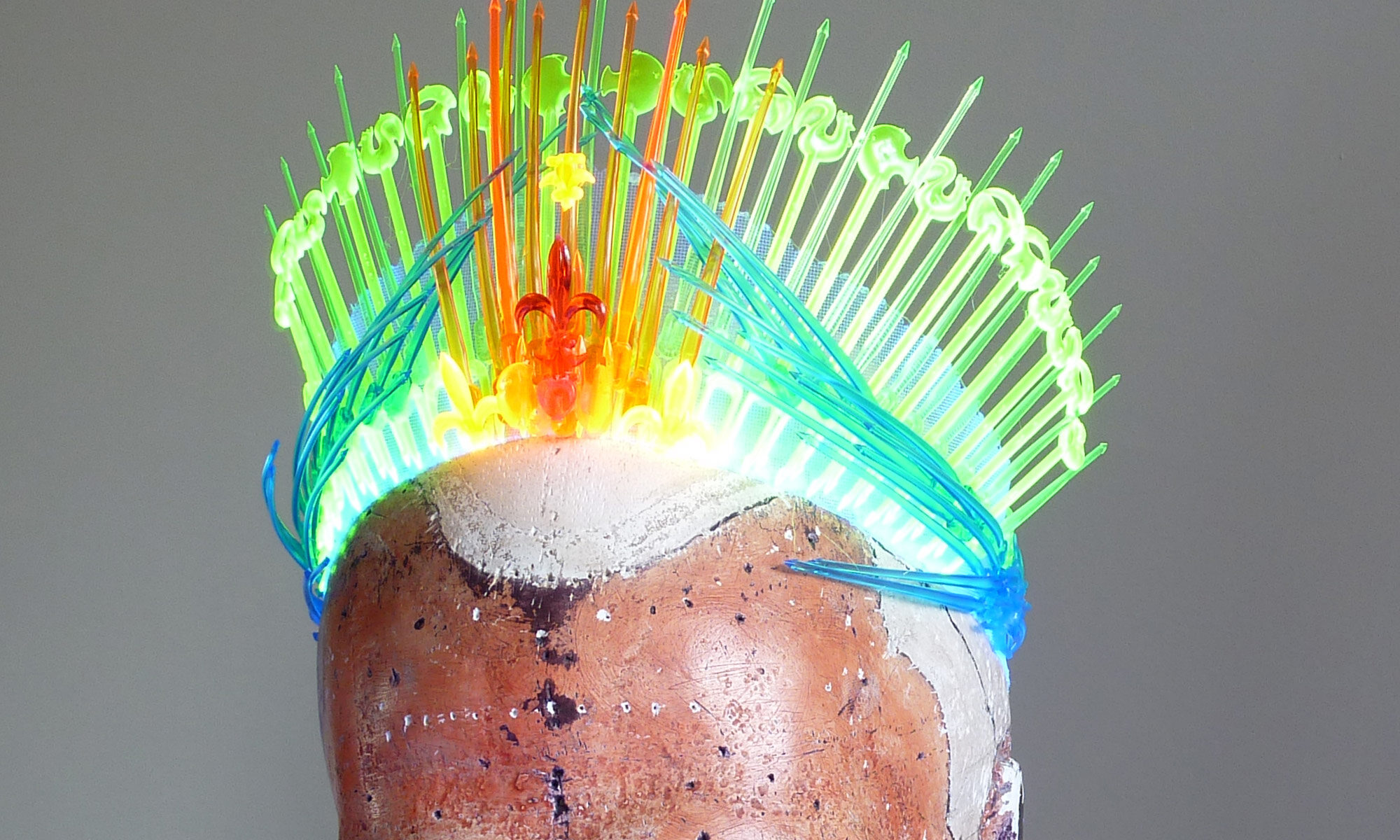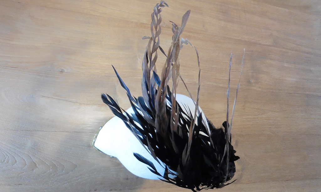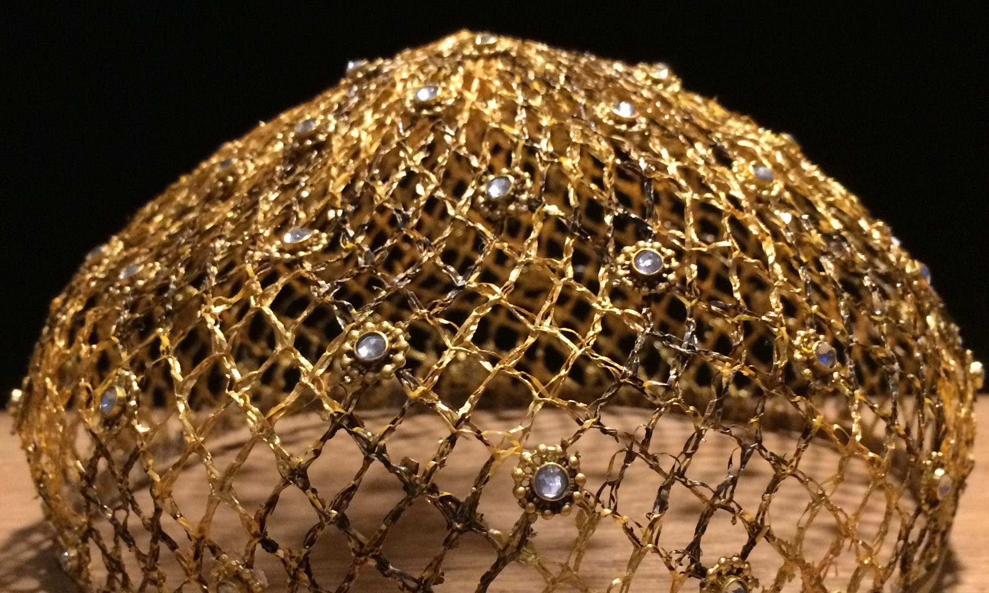 Verwendet wurden folgende Materialien (gehäkelt und vernäht): Atlasband, Metallspitze, Polyesterschmucksteine, Gewebekleber, Baumwollgarn, Maschendraht (Sechseckgeflecht), Filtermatte, Fiberglas (Fliegengitter), Nessel, Pailletten, Zierkordel, Acrylfarbe, Haarnadeln.